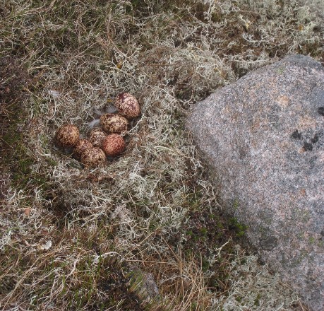 Ptarmigan eggs on a nest.