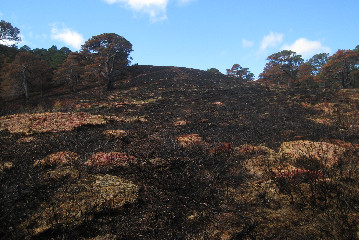 A charred hillside in the aftermath of a wildfire caused by a campfire which had smouldered underground for three days before re-igniting.