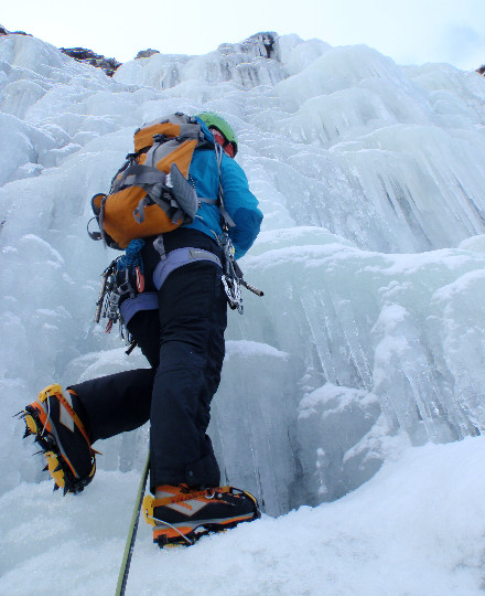 Wearing rigid-soled boots for ice climbing. (The crampons are C2)