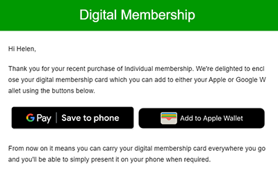 Existing members will receive an email with links to download their digital cards when they go live in the membership system, and new members will receive a similar email along with their membership and payment confirmation. Please note, you’ll need to be able to receive the emails to your smartphone and use Google or Apple wallet to download the cards.