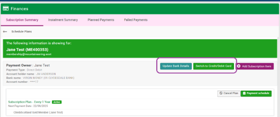 You can do this by logging into the members portal and selecting the green 'Finance' tile from the menu found at the top left of the screen. Here you should see your subscription listed. Click the 'View plans' button on the right hand side, then 'Update bank/card details' in the top right of the following screen. If you require any assistance with this please contact us.