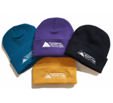 Fun range of soft, colourful beanie hats with turn up to keep your ears cosy, plus our embroidered logo (choice of teal blue, purple, black and mustard yellow).
