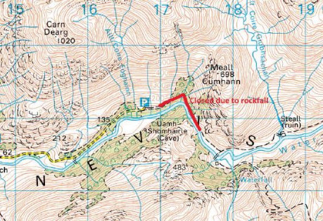 In the meantime, however, both paths are closed. JMT have advised that anyone wishing to access the upper part of Glen Nevis can avoid the danger area by ascending to the bealach north of Meall Cumhann at GR NN178700, drop down into Coire Guibhsachan and descend to Steall Ruin at GR NN188688. There is no path on this route, which is only recommended to experienced walkers with the knowledge and means to navigate the route safely.