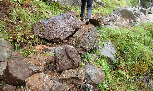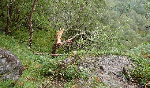 An initial inspection by the John Muir Trust showed that as well as boulders and impact craters on the track, there were loose blocks hung up on trees, loose uprooted and hanging trees immediately above the path, and still large, loose debris high up where the rockfall originated.