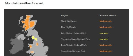 The Mountain Weather Information Service produces forecasts for ten different mountain areas of the UK as an aid to mountain safety.