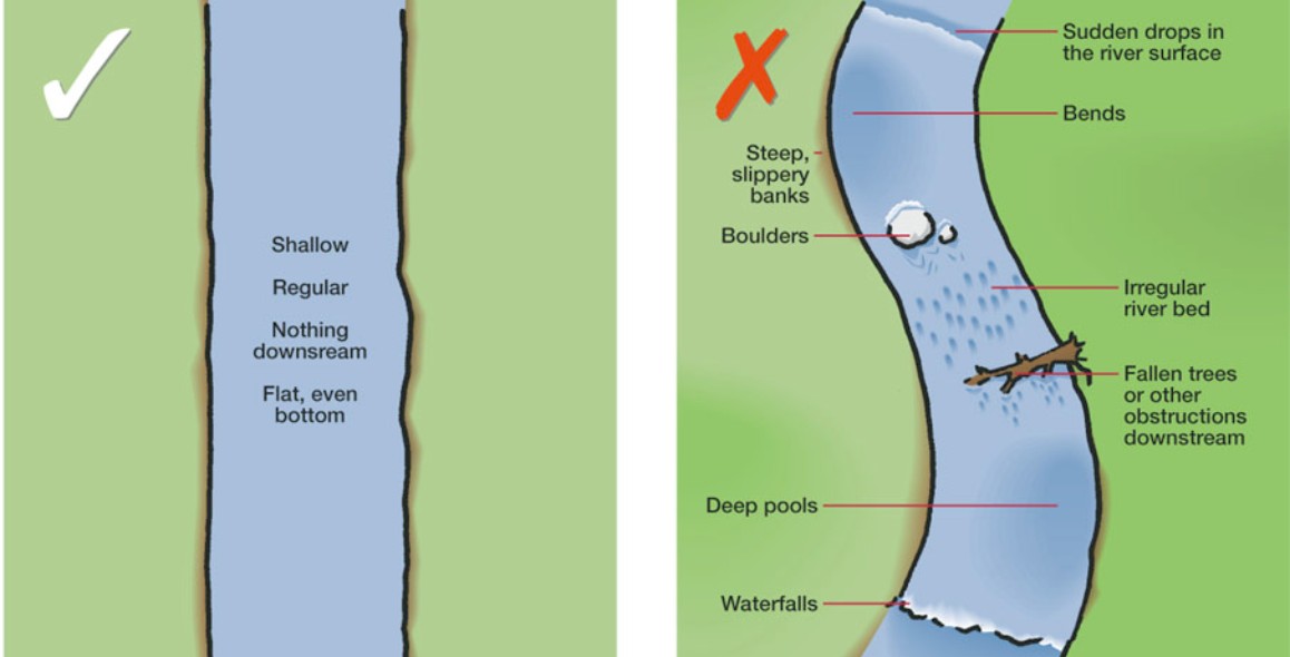 A wide, slow flowing section with easy access and exit and a smooth bed surface would be the ideal. Bends in the burn should be avoided as the flow of water accelerates on the outside of the bend and the bank may be undercut.